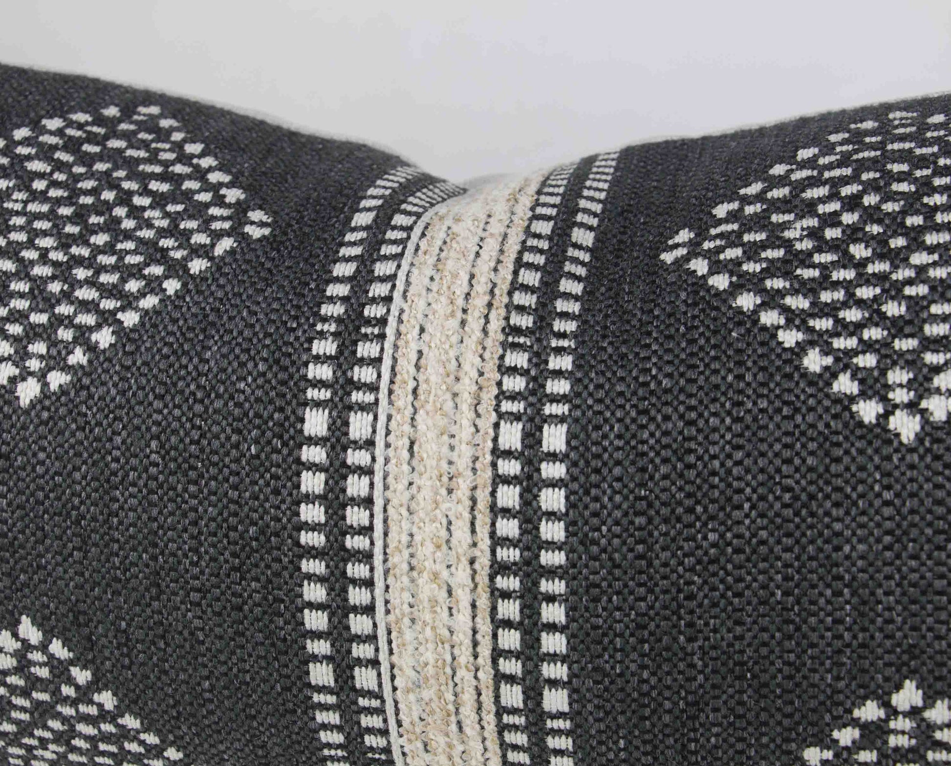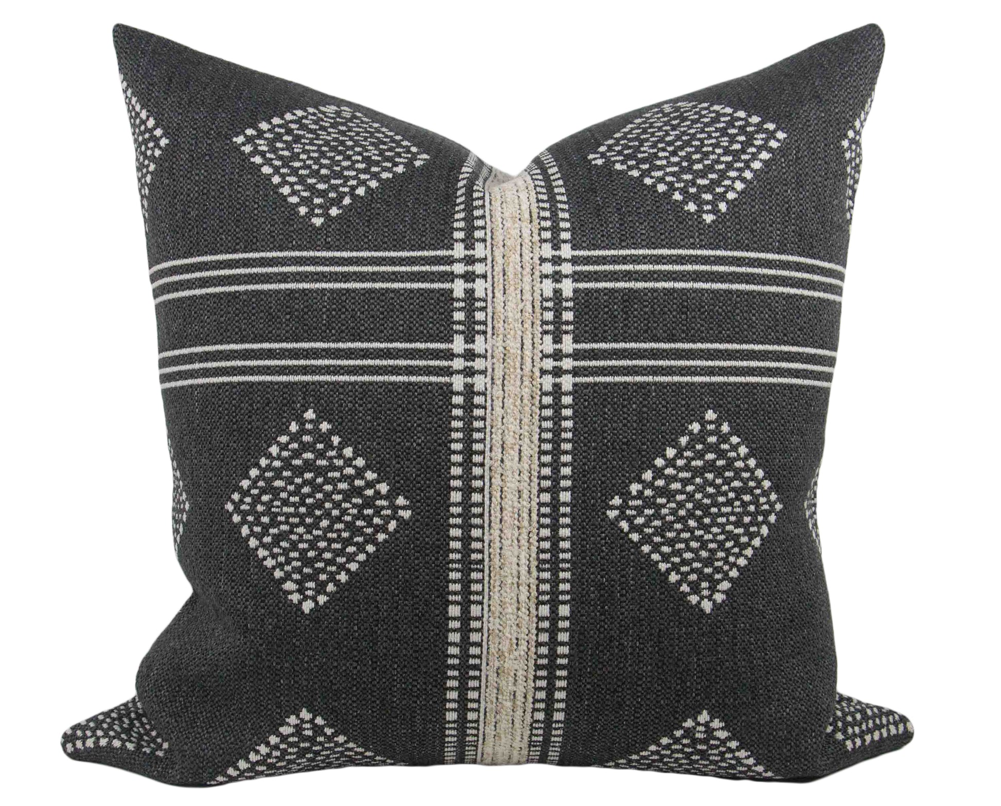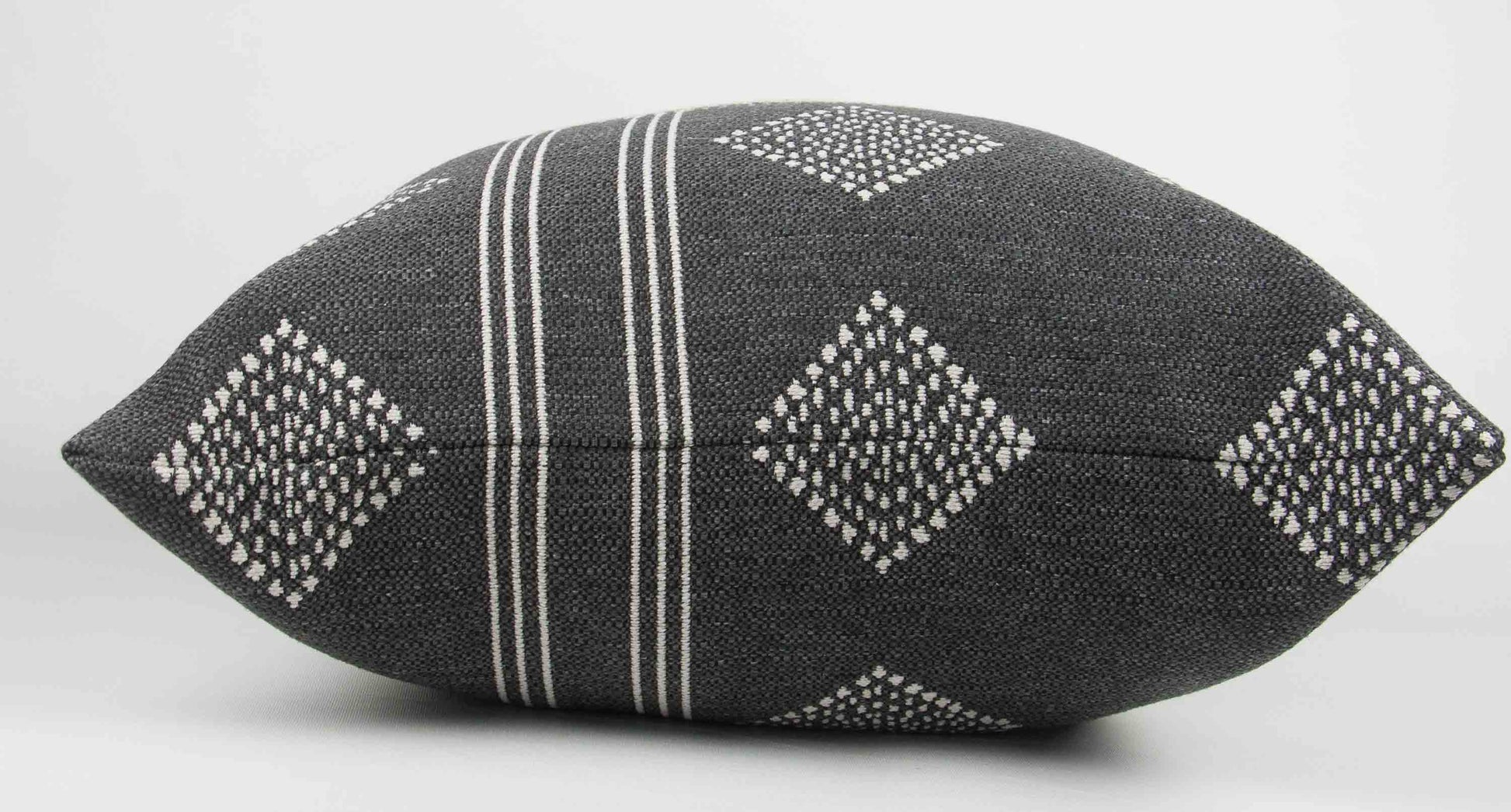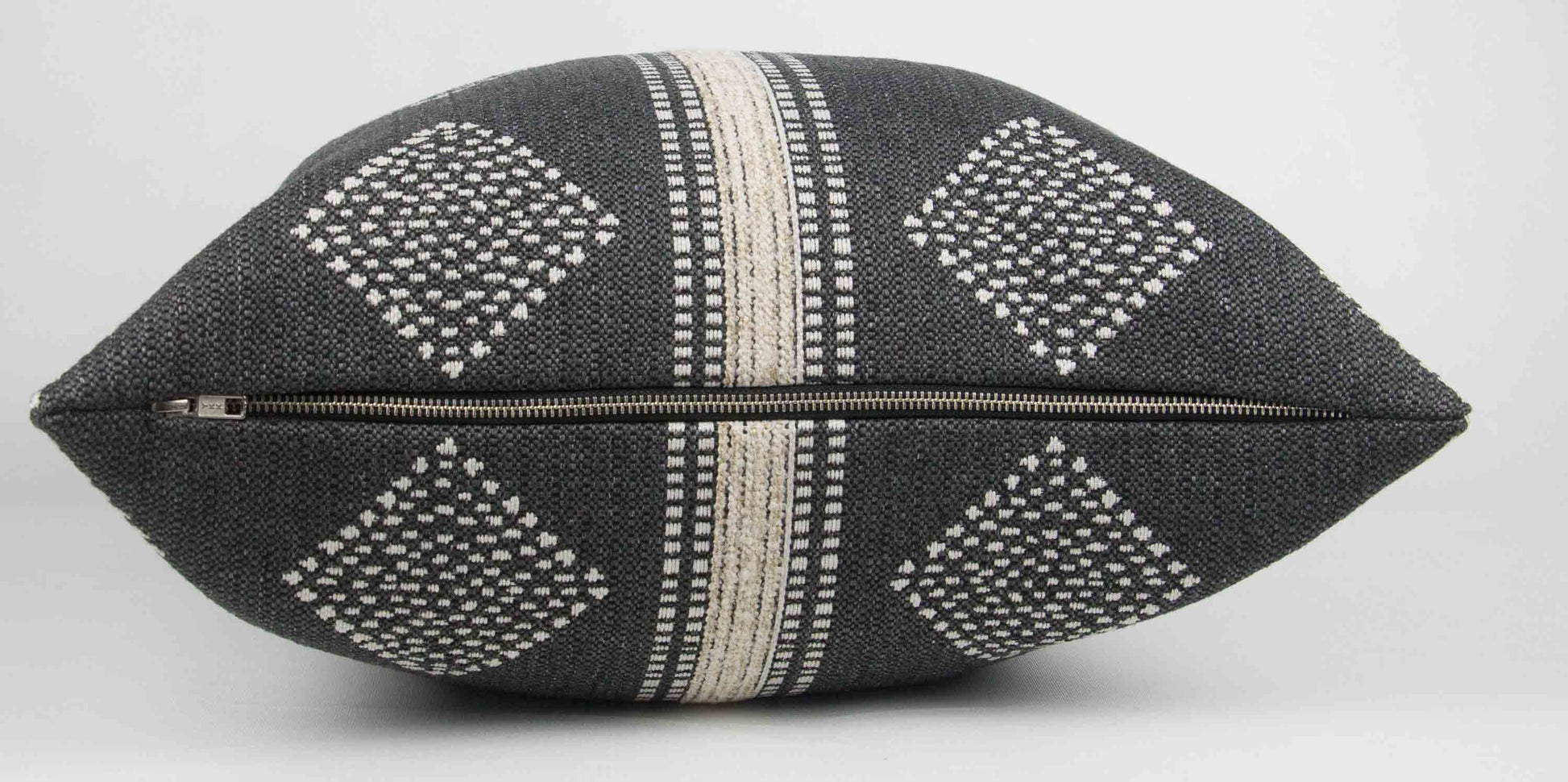 This pillow cover has been made with care using a charcoal & cream fabric with tons of texture. Cream stripes & dotted diamonds combine to create a graphic boho pattern. The designer fabric is made from 100% olefin, a high performance fabric that is stain resistant.