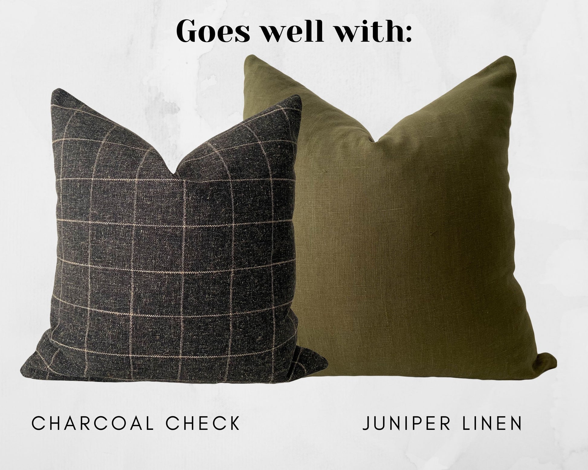 This pillow cover has been made with care using a deep olive green fabric in 100% linen. The back is finished in a complementary linen blend fabric.