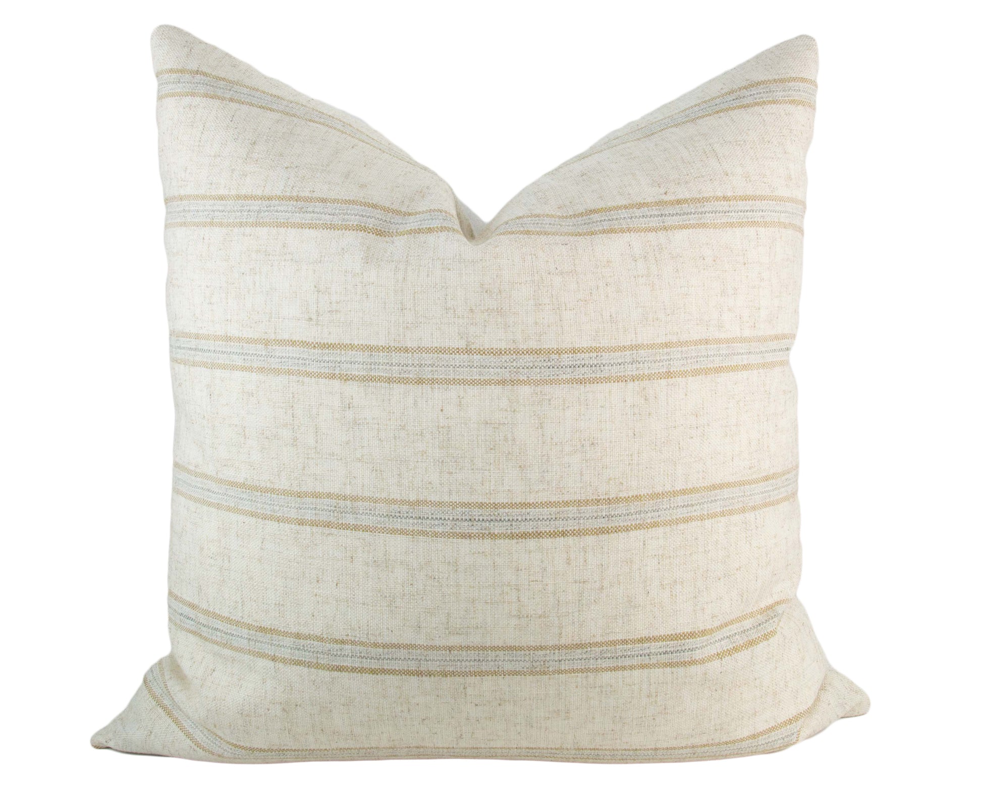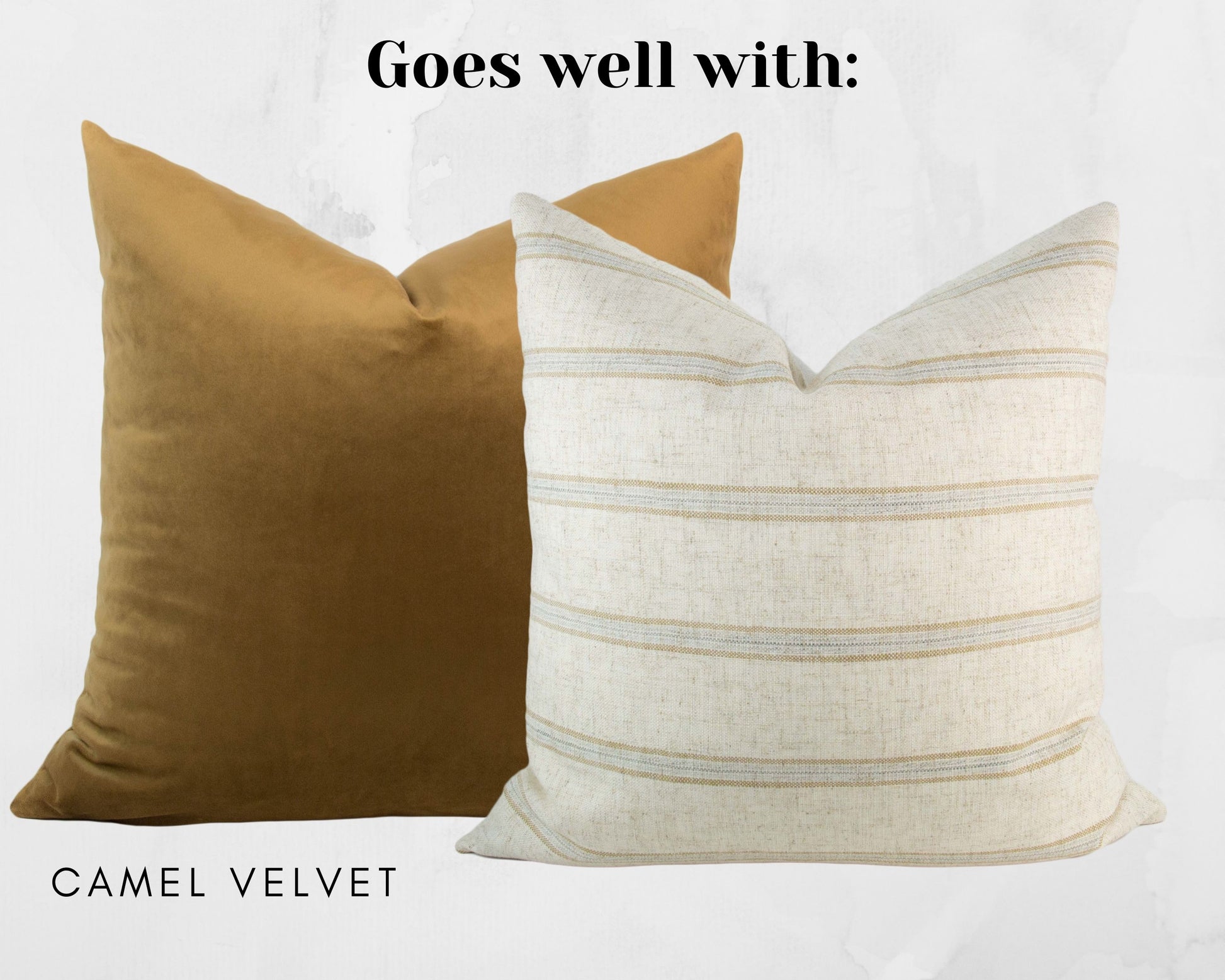 This pillow cover has been made with care using an oatmeal linen blend fabric with golden sand & medium grey stripes. The warm neutral tones blend well with just about any other neutrals - I especially love it with the Camel Velvet pillow