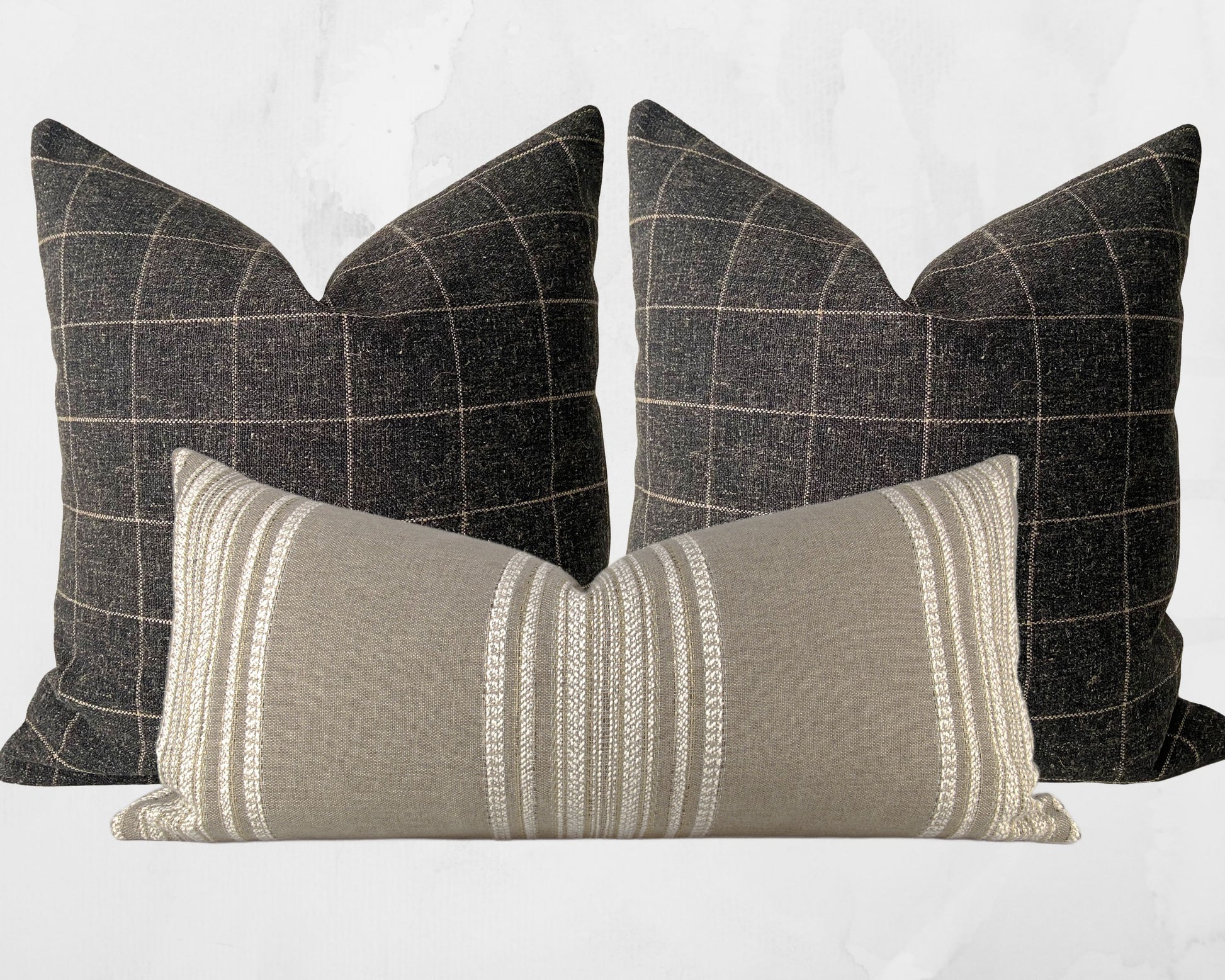 Create a statement in your living area with Charcoal Check Combo #1. This set includes two charcoal and cream check pillow covers and a beige striped lumbar pillow cover, all handmade with care. The woolly, textured charcoal check adds visual appeal and the timeless beige striped fabric with accents of cream and golden wheat effortlessly blends into any decor.