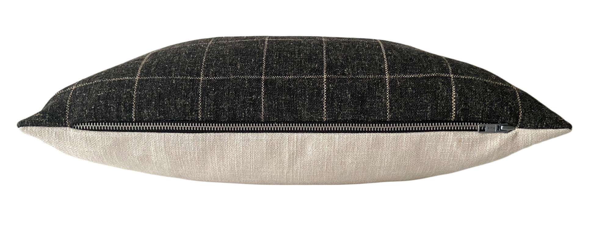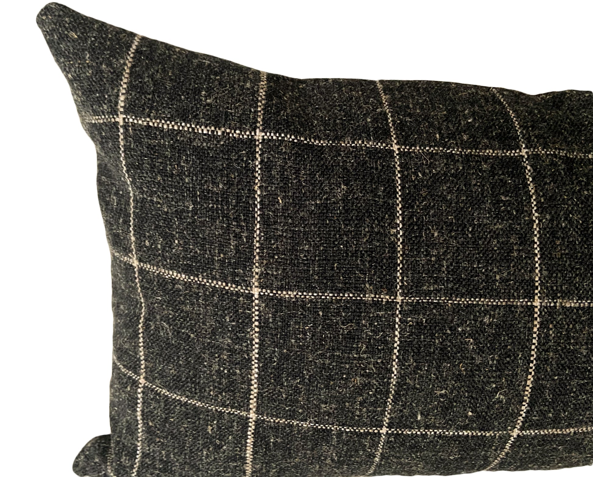 This pillow cover has been made with care using a charcoal & cream check fabric with tons of texture. It's got a woolly, slightly masculine feel that adds interest but can easily blend with other patterns. Photos show 12x20" pillow.