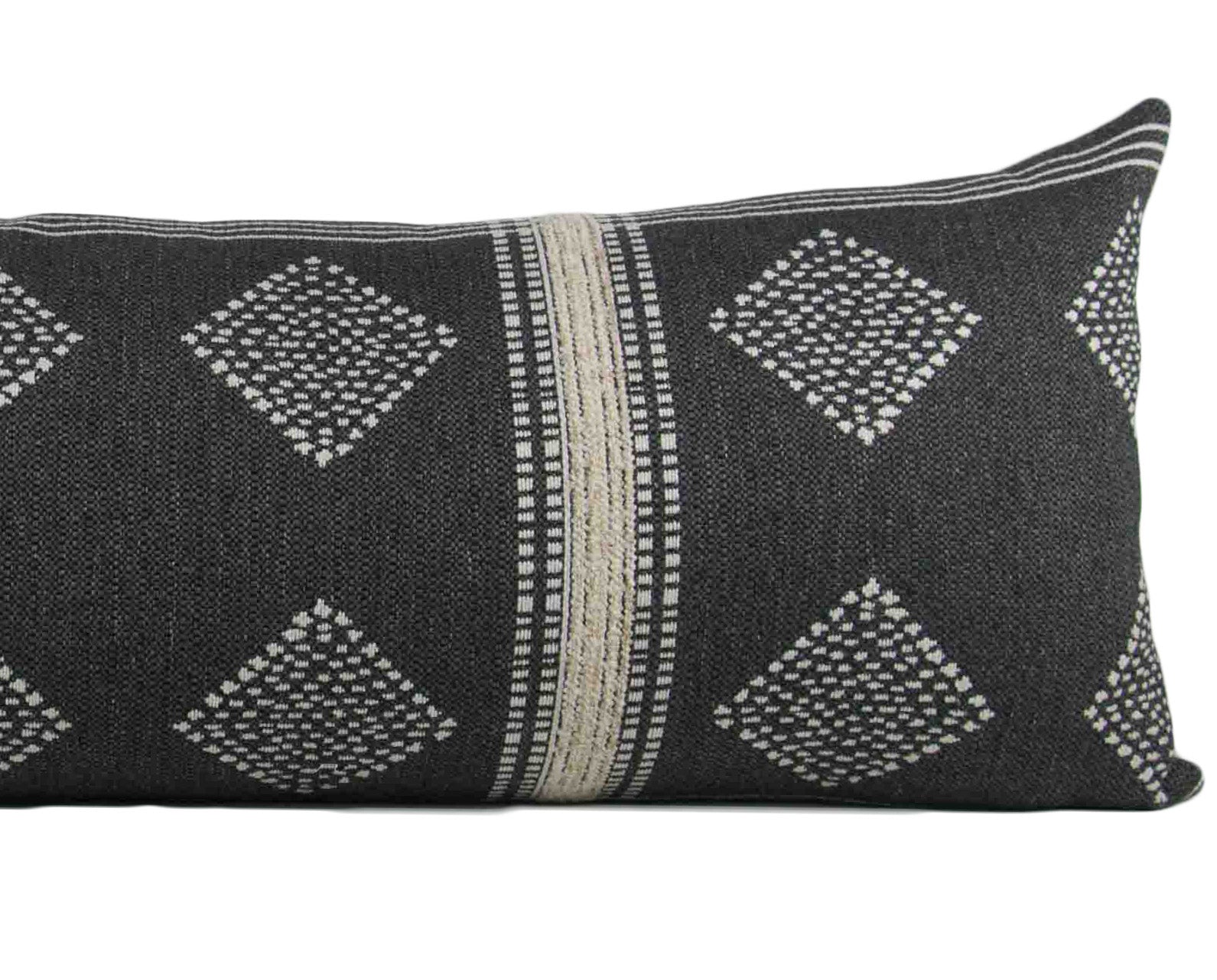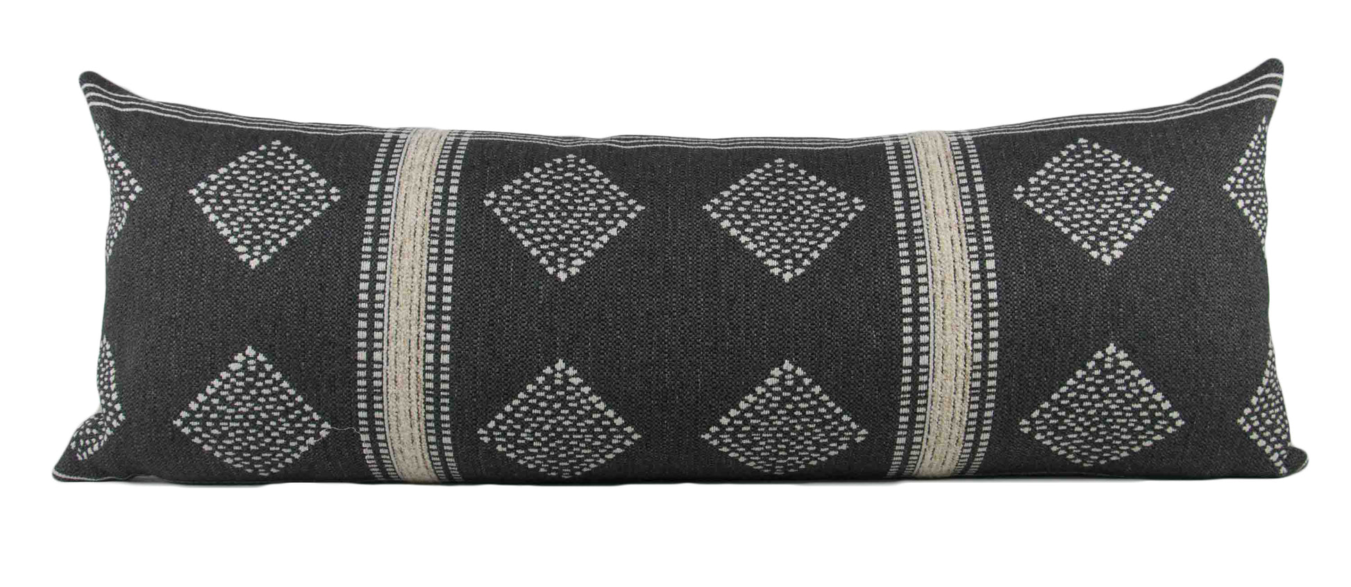 This 14x36" long lumbar pillow cover has been made with care using a charcoal & cream fabric with tons of texture. Cream stripes & dotted diamonds combine to create a graphic boho pattern. The designer fabric is made from olefin, a high performance fabric that is stain resistant.