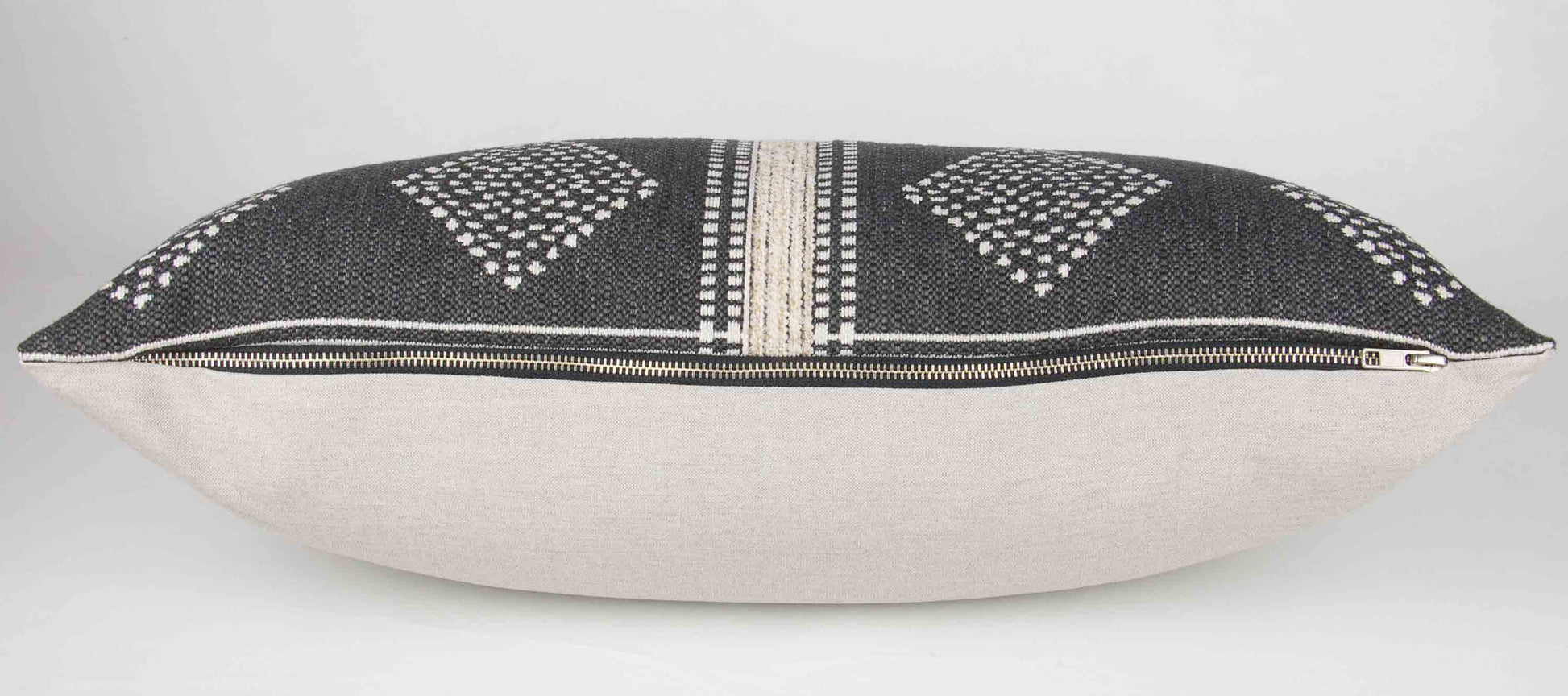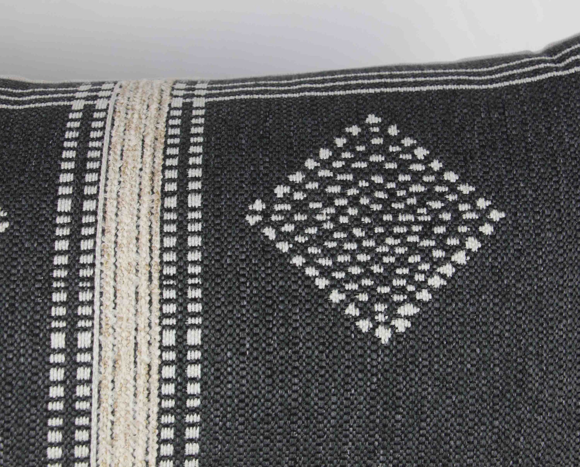 This lumbar pillow cover has been made with care using a charcoal & cream fabric with tons of texture. Cream stripes & dotted diamonds combine to create a graphic boho pattern. The designer fabric is made from 100% olefin, a high performance fabric that is stain resistant. Photos show a 12x24" pillow.