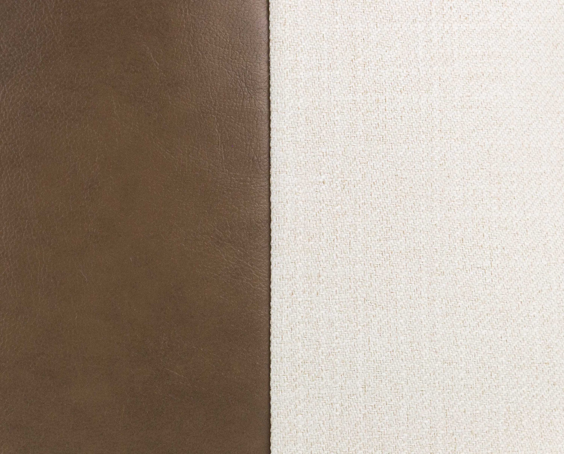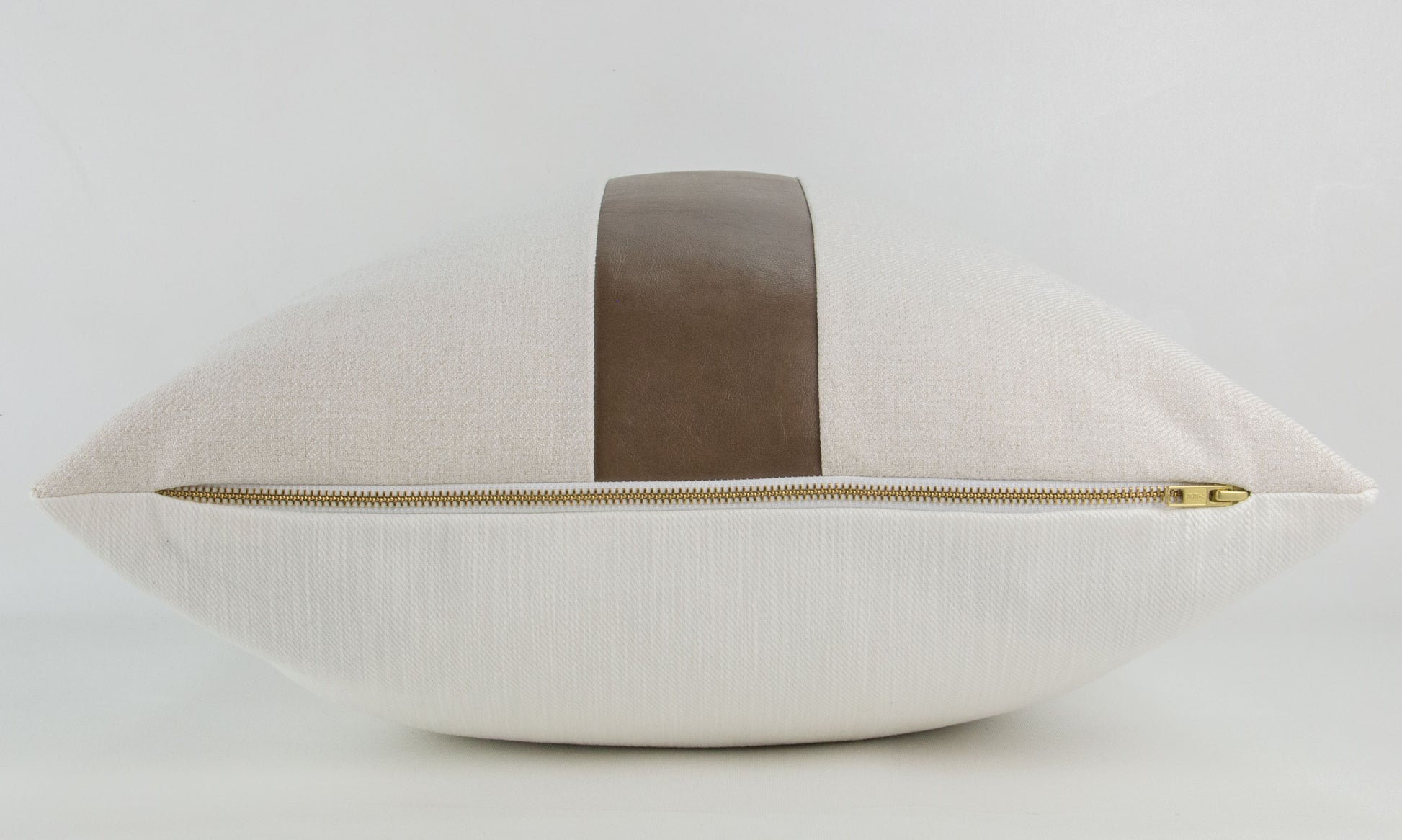 This 20x20" pillow cover has been made with care using a caramel vegan leather (faux leather) and a beige textured fabric.