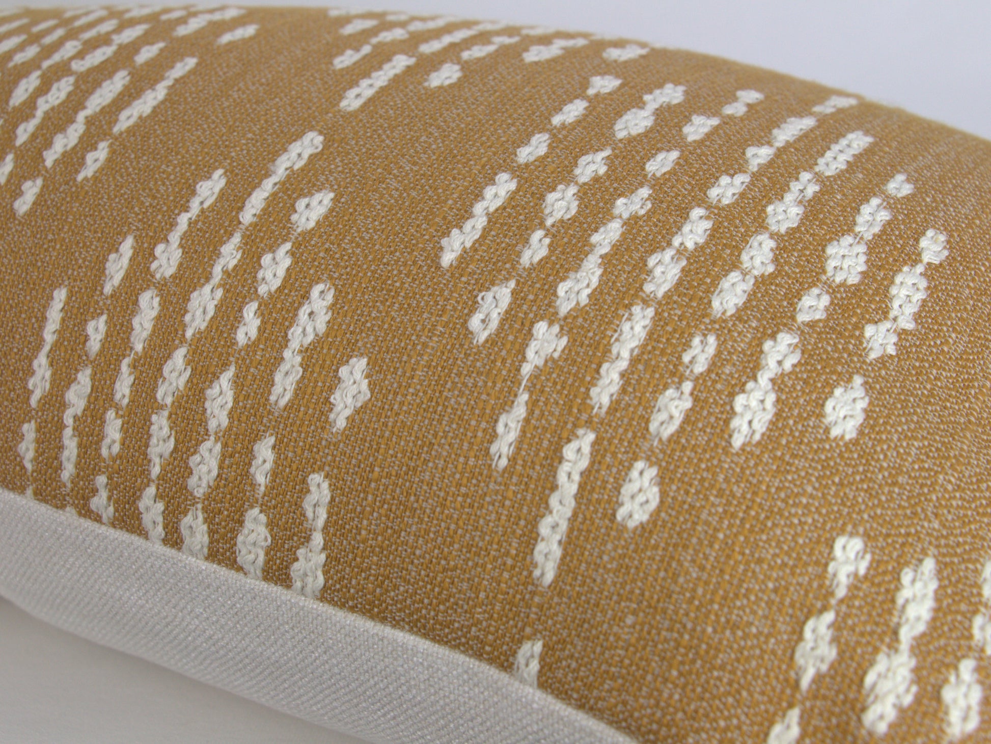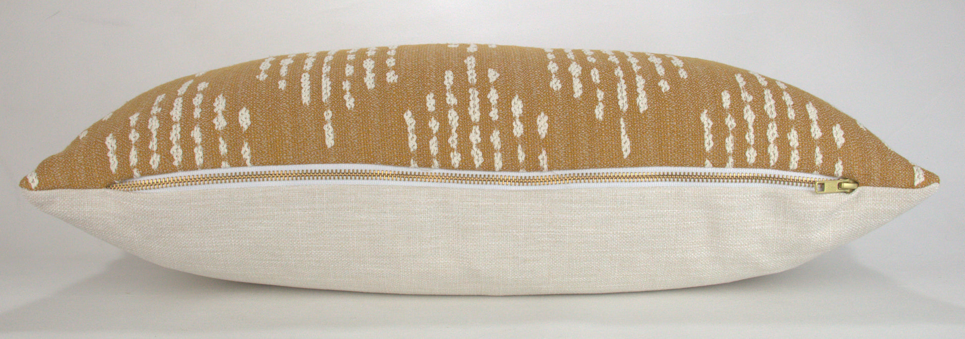 This 12x24" lumbar pillow cover has been made with care using a gold and white geometric pattern fabric. The warm tones blend well with other neutrals - perfect for adding texture and interest to any space.