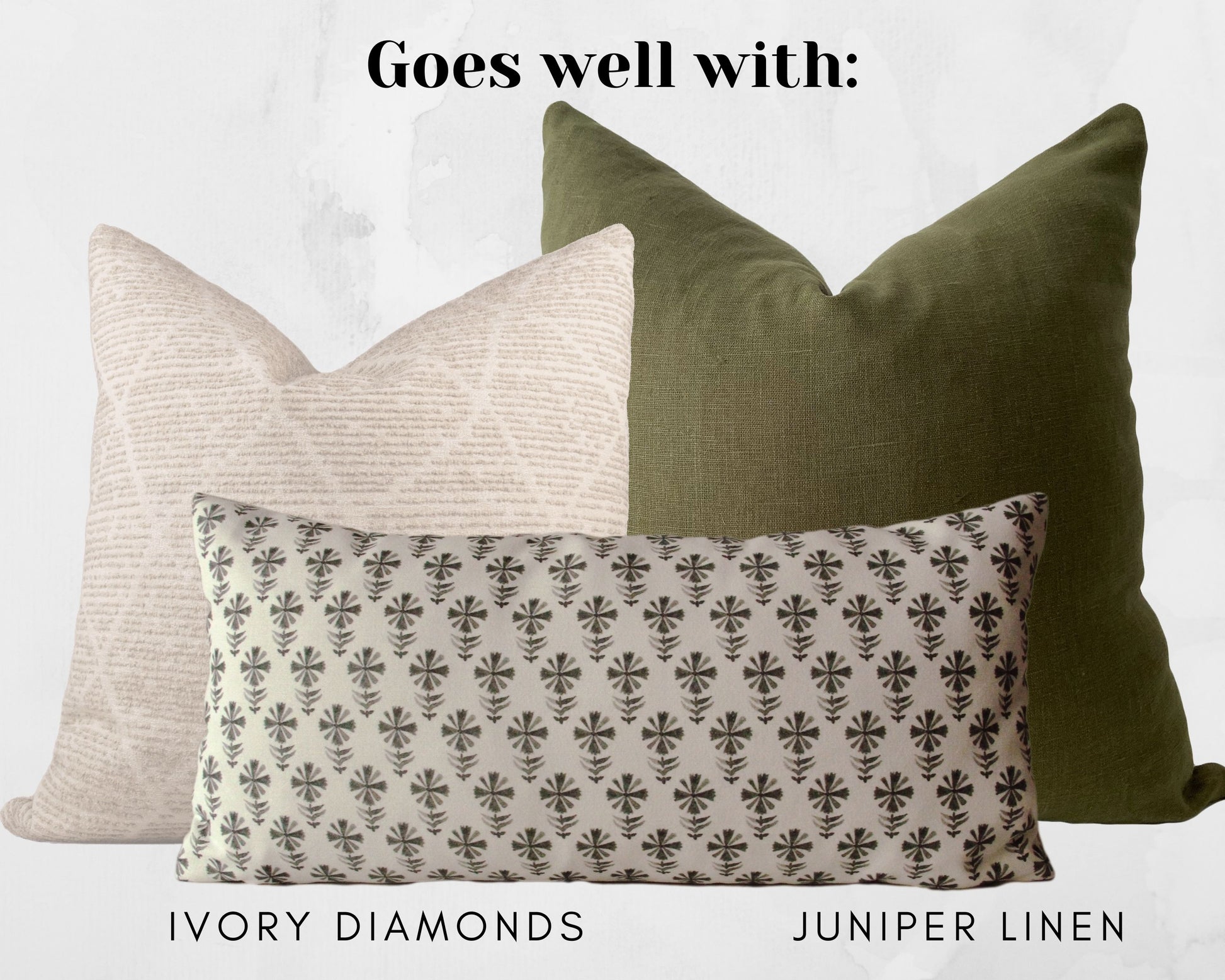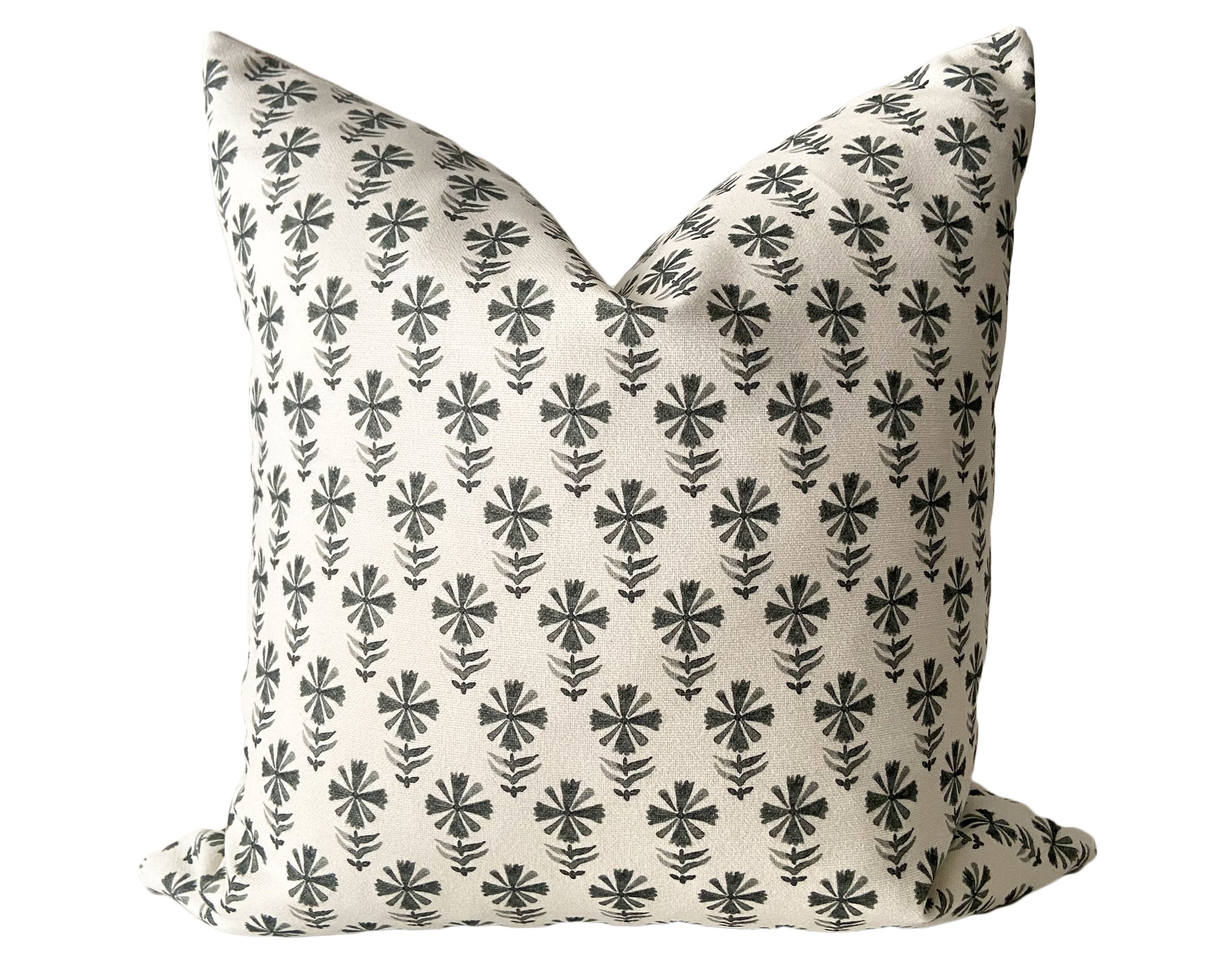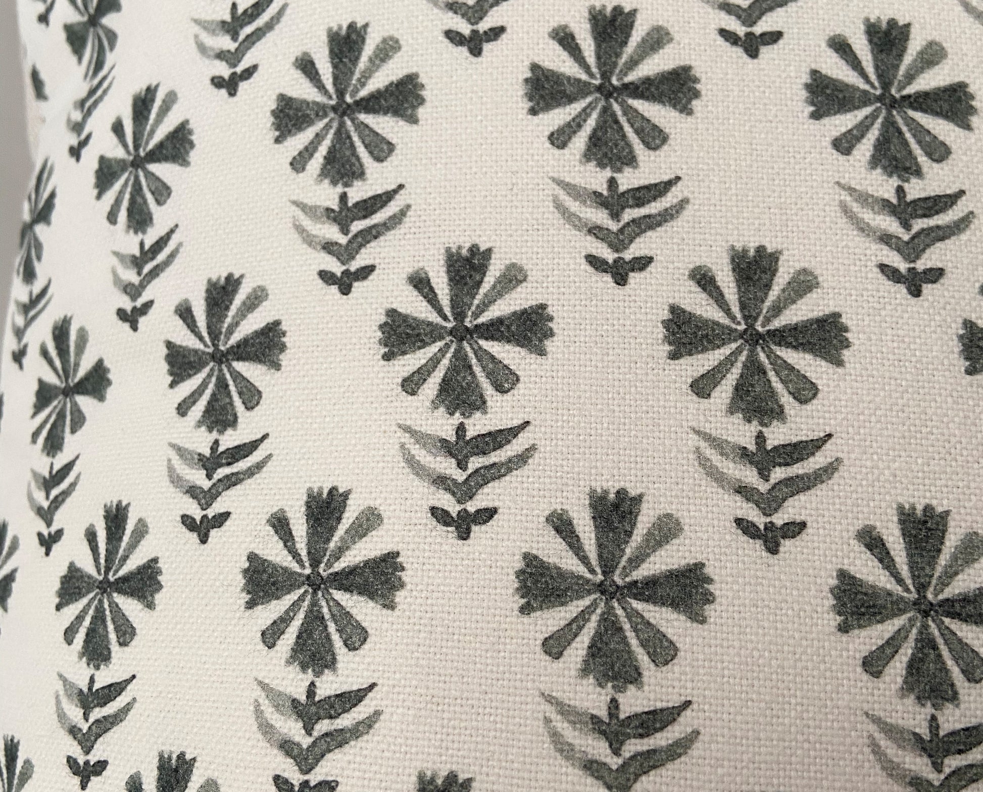 This pillow cover has been made with care using a modern block print fabric. The greenish-grey block print flowers create a pretty geometric pattern across a soft cotton background.