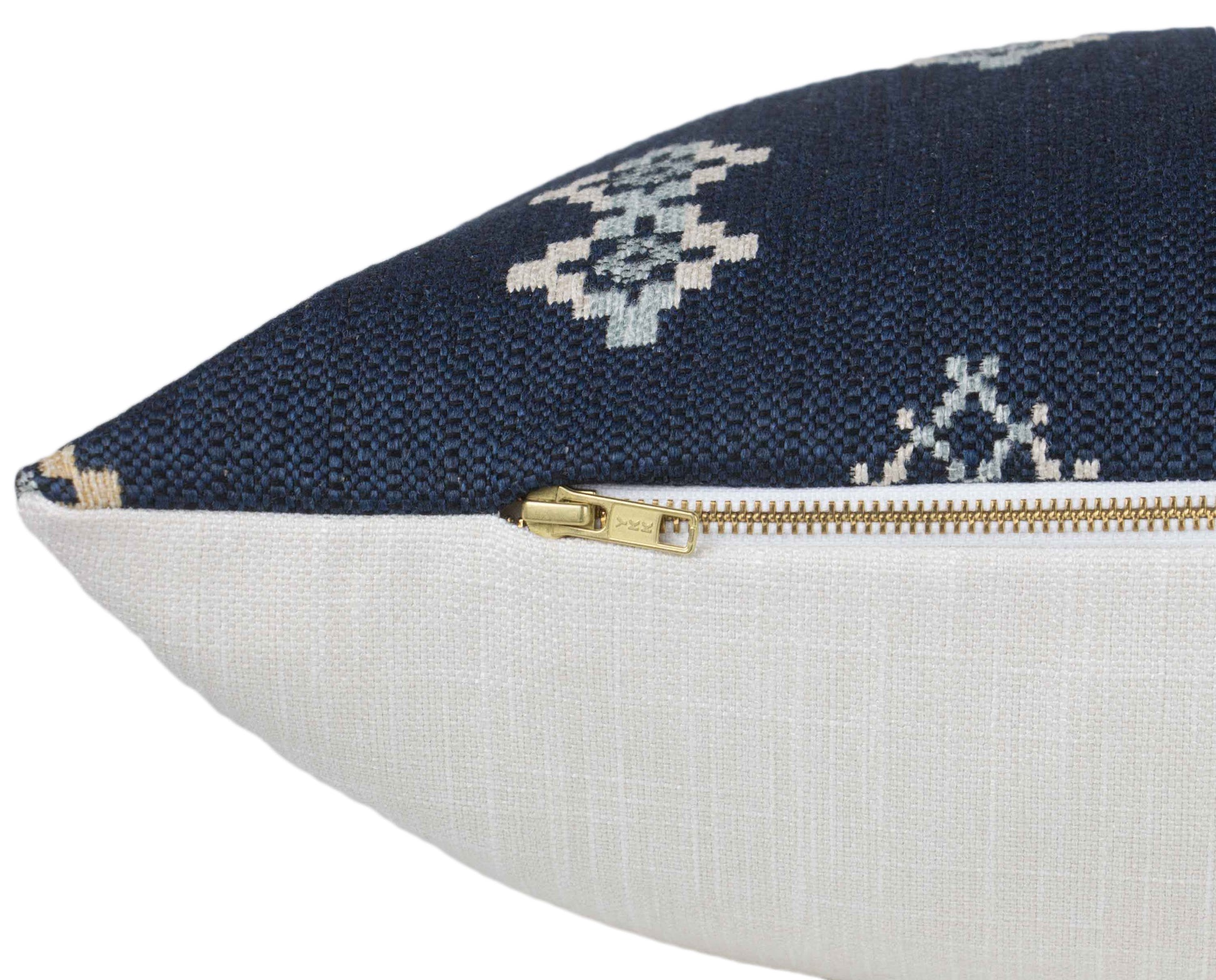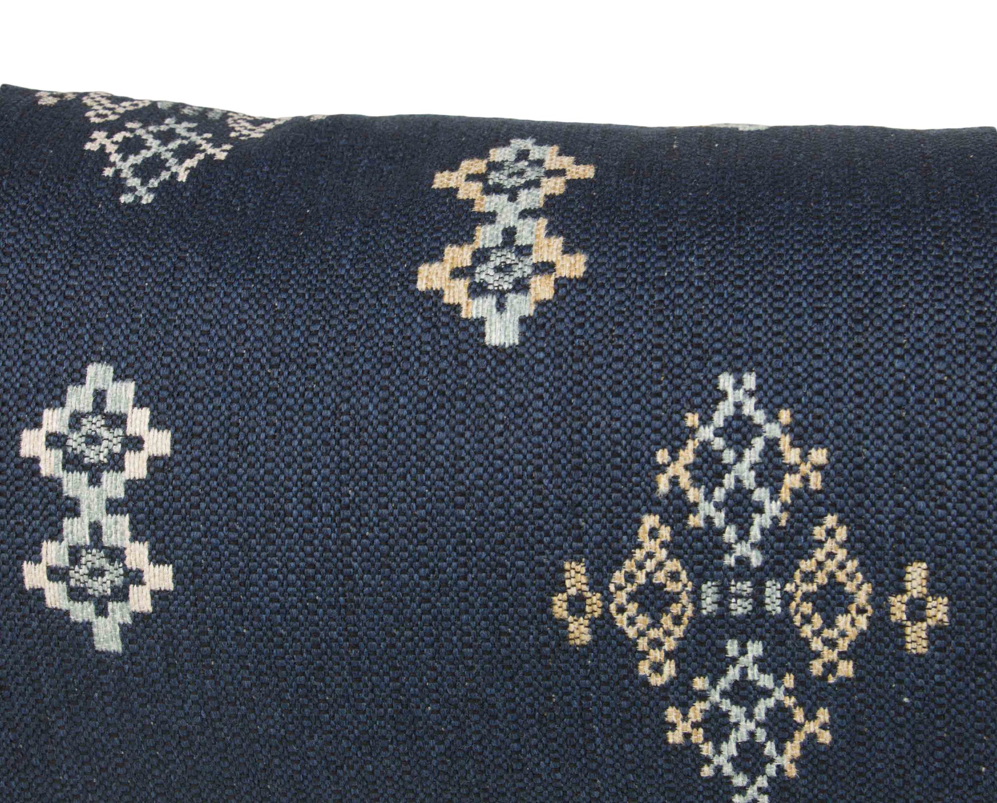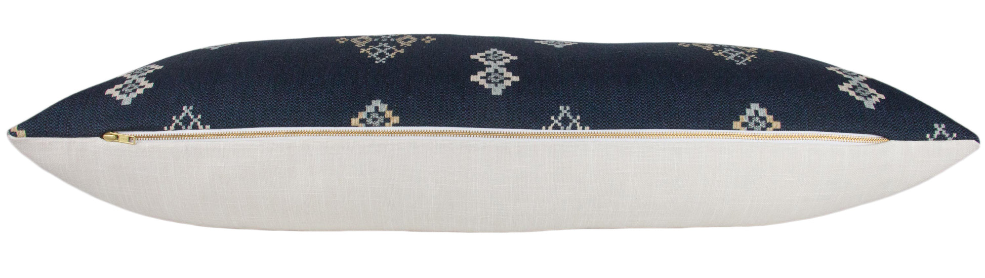 This 14x36" long lumbar pillow cover has been made with care using a deep indigo blue woven fabric. Cream & rust diamonds combine to create a tribal boho pattern. The designer fabric is made from 100% olefin, a high performance fabric that is stain resistant.