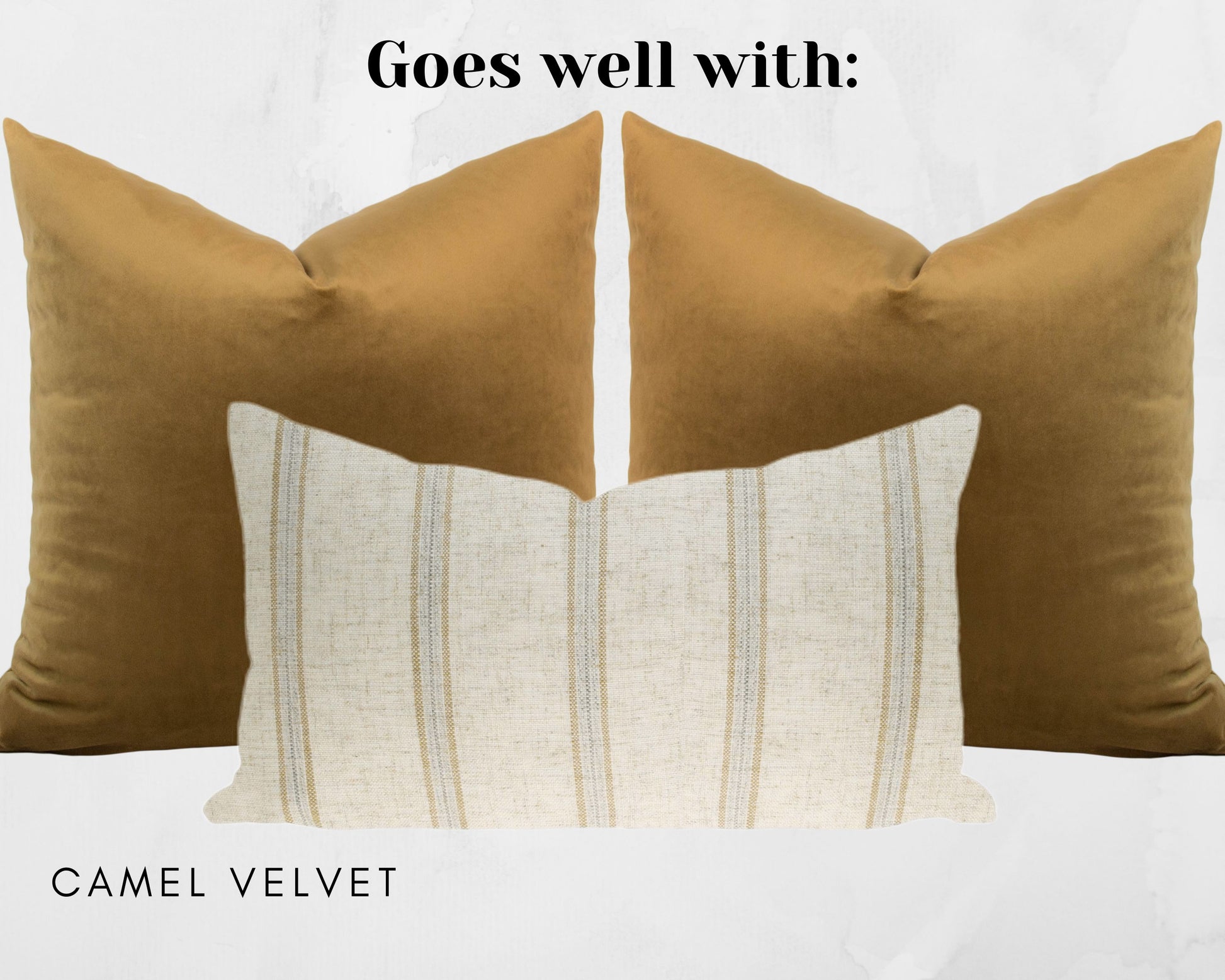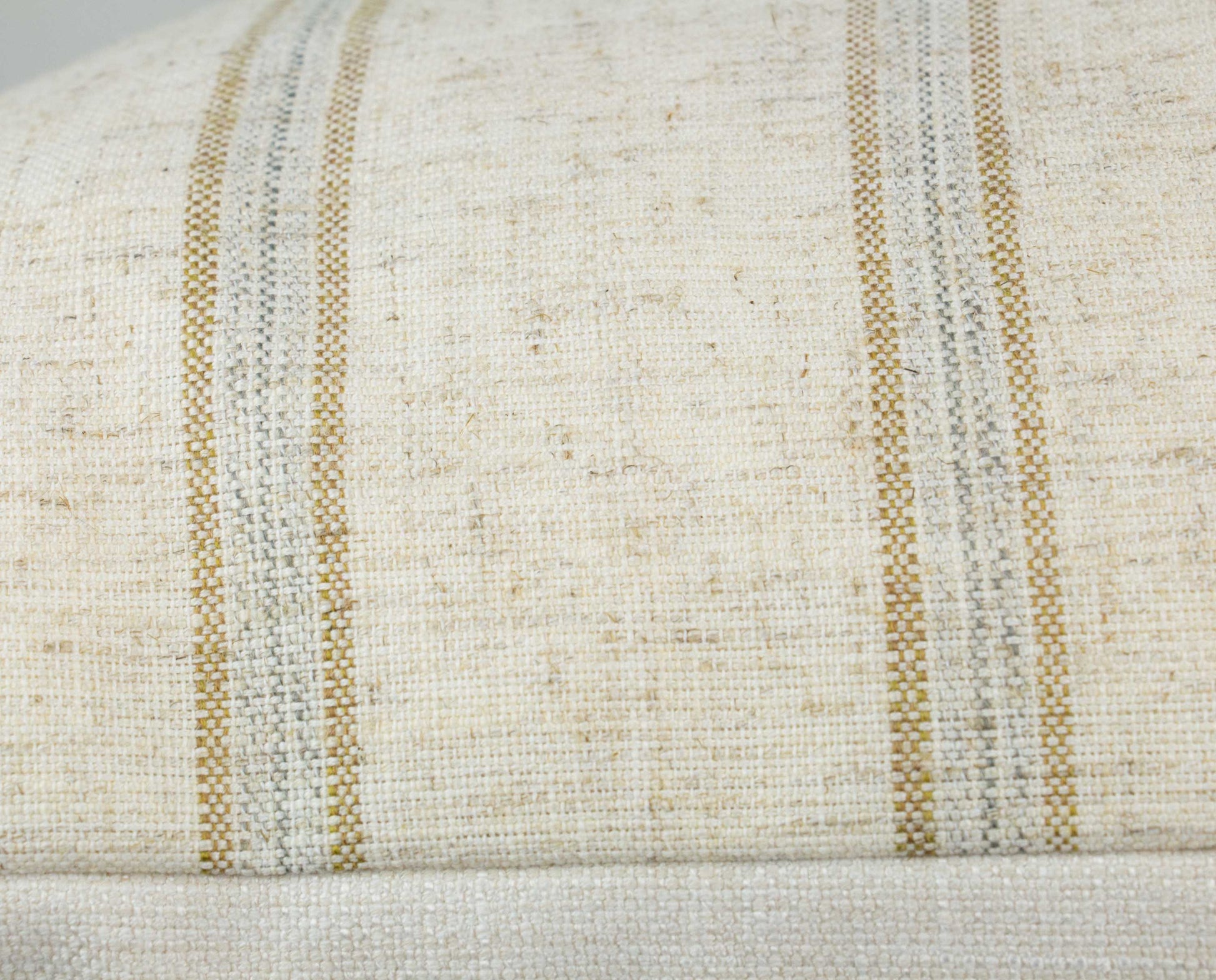 This 12x20" lumbar pillow cover has been made with care using an oatmeal linen blend fabric with golden sand & medium grey stripes. The warm neutral tones blend well with just about any other neutrals - I especially love it with the Camel Velvet pillow