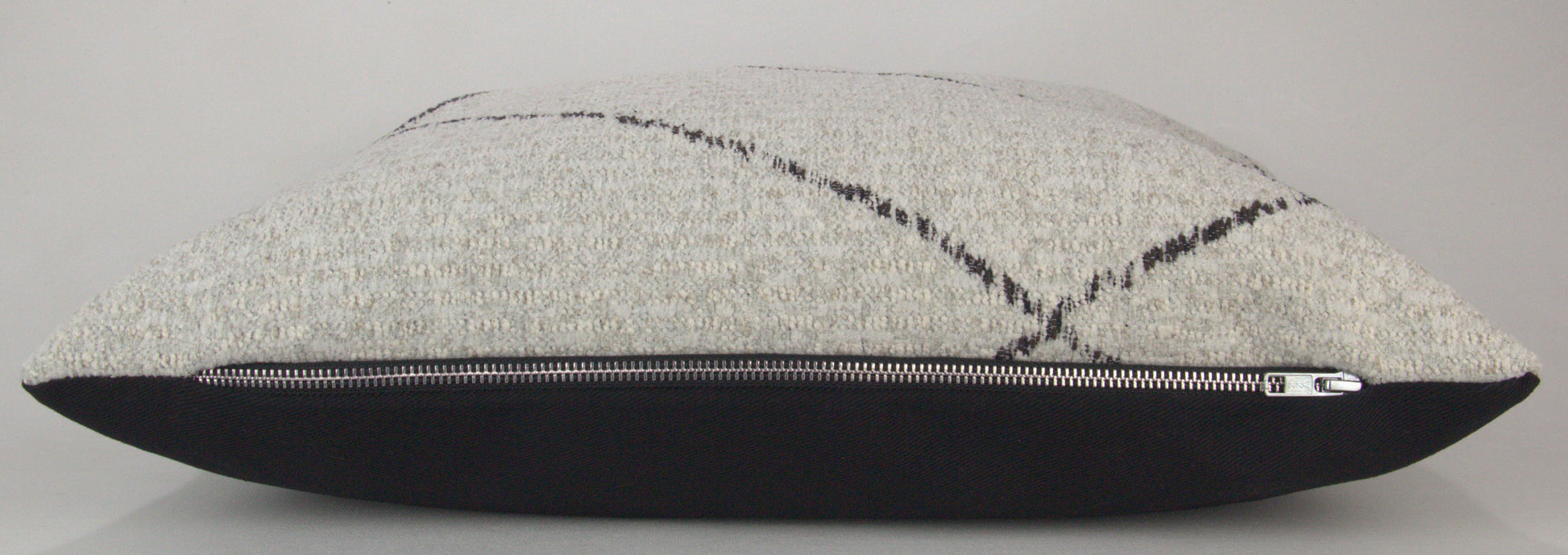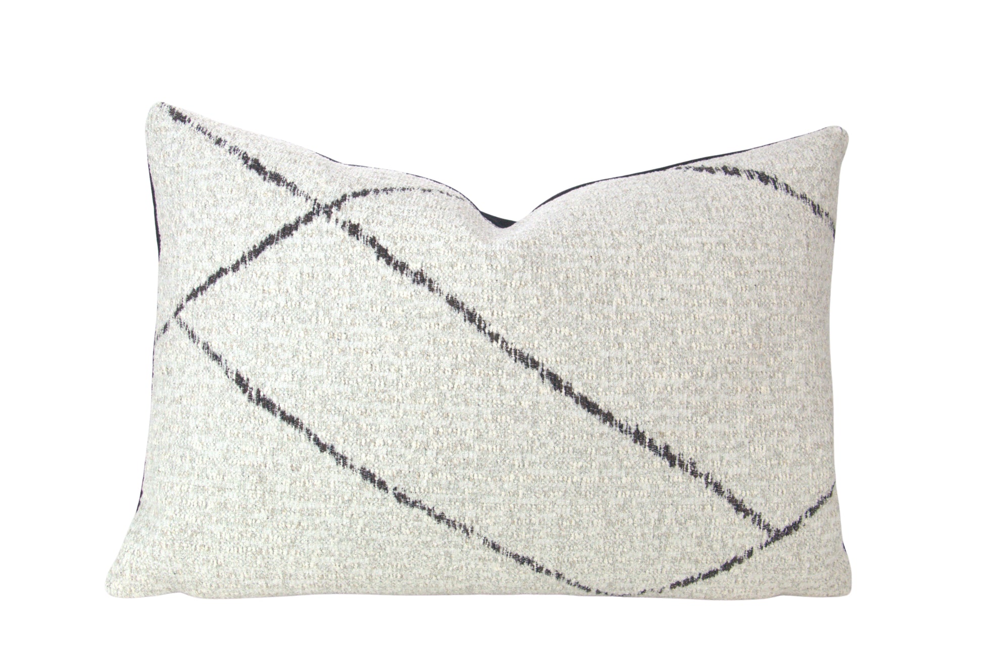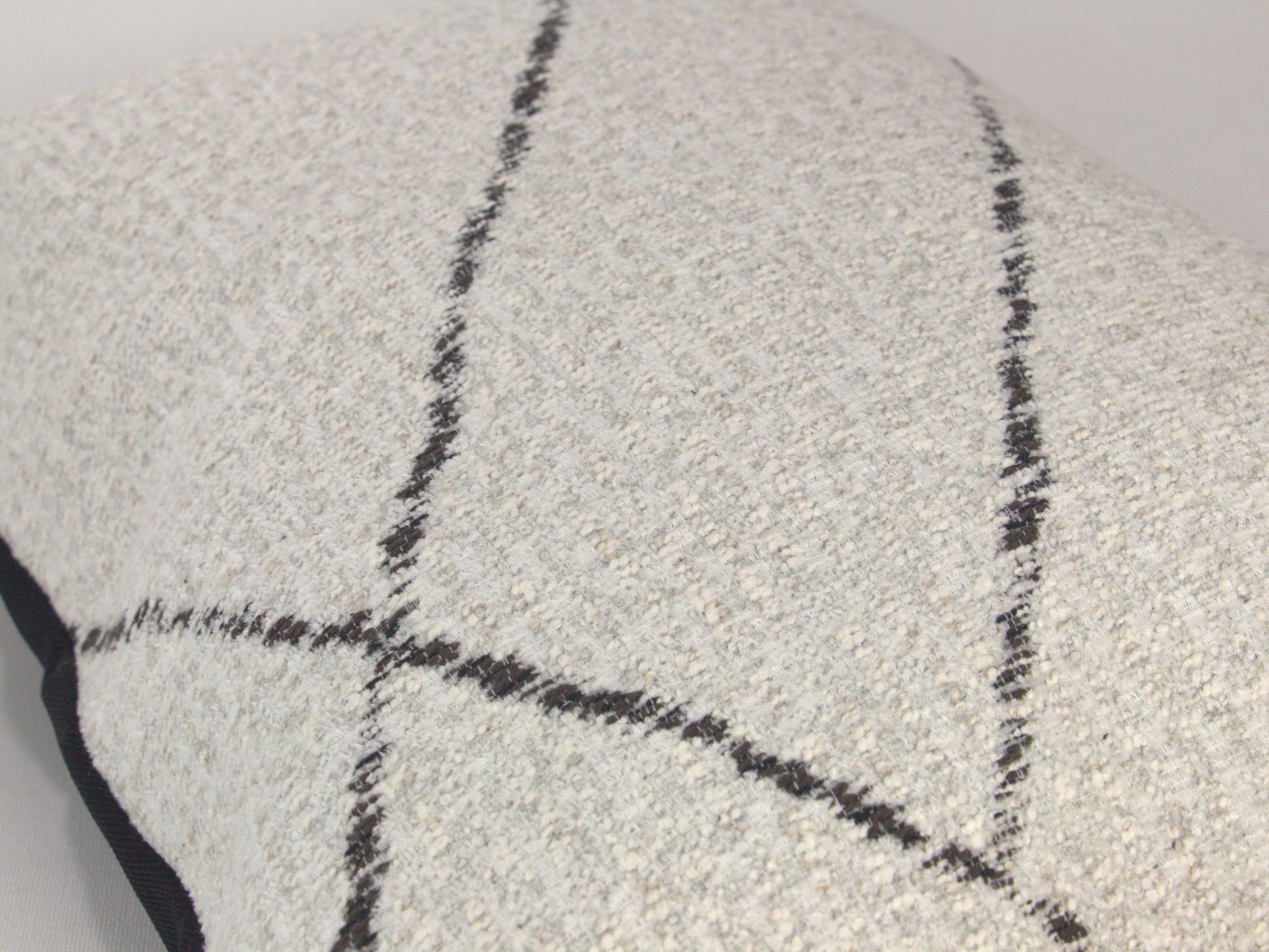 This lumbar pillow cover has been made with care using a Moroccan inspired white fabric with tons of texture. The white is woven through with flecks of grey and taupe, and accented with black lines for a modern boho vibe, like a cozy Beni Ourain for your sofa.